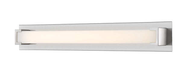 Regular price $205.401 Light Vanity --- A slender horizontal silhouette draws the eye in a fashionable direction, adding luster to modern bath spaces. Beautifully finished in brushed nickel, this one-light vanity fixture features an obscured acrylic diffuser and... -