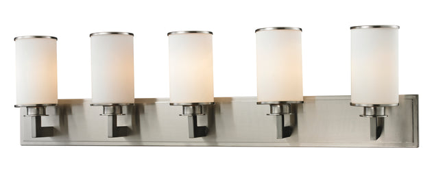 Regular price $172.905 Light Vanity --- The contemporary Savannah family adds sophistication to home décor. The beautifully appointed brushed nickel fixture is perfectly paired with matte opal glass shades in this 5 light vanity. Specifications Style Number 412-5V...