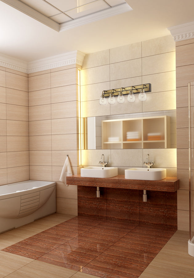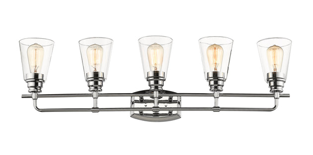 Regular price $226.205 Light Vanity --- Span a spacious countertop with this beautiful five-light chrome vanity light for the bathroom. Designed for elegance, this Annora collection fixture boasts five clear glass shades with vintage-style light bulbs (not included).... -