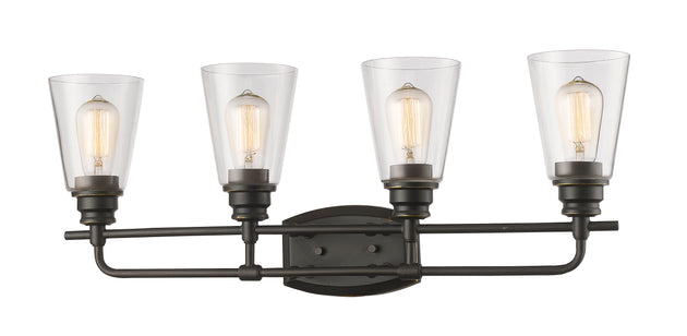 Regular price $159.904 Light Vanity --- Harmony of vintage style fixture, clear glass, and vintage bulb(not included) shapes define the Annora family. Clear glass paired with olde bronze fittings complete the look. Specifications Style Number 428-4V-OB Install PDFs... -