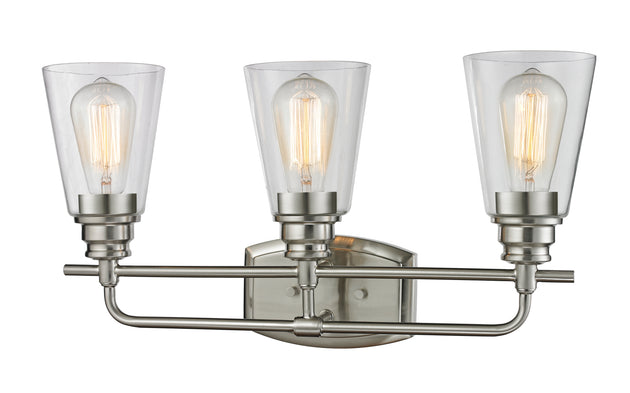 Regular price $135.203 Light Vanity --- Harmony of vintage style fixture, clear glass, and vintage bulb (not included) shapes define the Annora family. Clear glass paired with brushed nickel fittings complete the look. Specifications Style Number 428-3V-BN Install... -