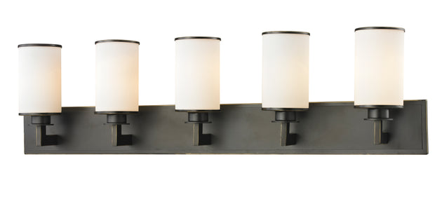 Regular price $165.105 Light Vanity --- The contemporary Savannah family adds sophistication to home décor. The beautifully appointed olde bronze fixture is perfectly paired with matte opal glass shades in this 5 light vanity. Specifications Style Number 413-5V... -