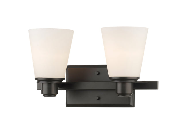 Regular price $91.002 Light Vanity --- Embrace the rich feel of an olde bronze finish as it defines the silhouette of this two-light vanity fixture. Modern in character, its vintage bulbs and hood shades create a softening effect... -