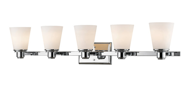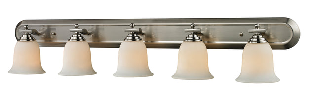Regular price $189.805 Light Vanity --- The polished look of this glamourous, five light, brushed nickel vanity is achieved through its combination of its matte opal shades, its elegant detailing and its unique shape. Specifications Style Number 704-5V-BN... -