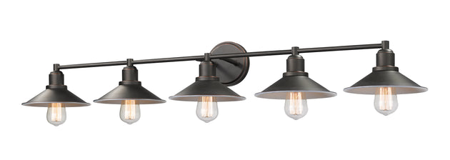 Regular price $211.905 Light Vanity --- Design a stylish master en suite around the dynamic silhouette of this five-light vanity fixture. Luscious olde bronze finish steel creates a balanced mount and frame with hood shades and charming vintage... -