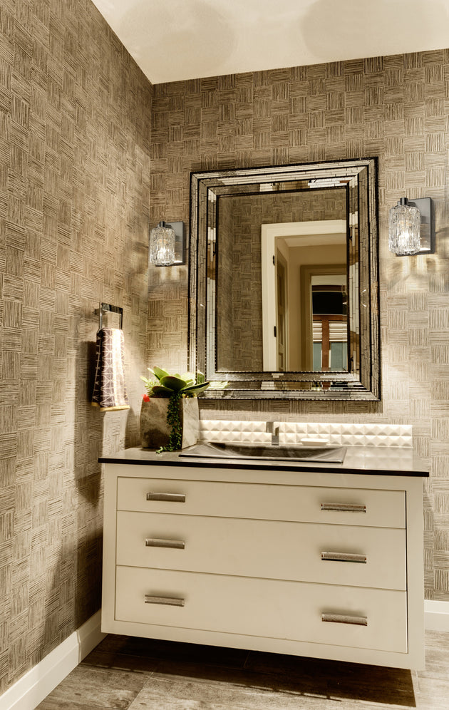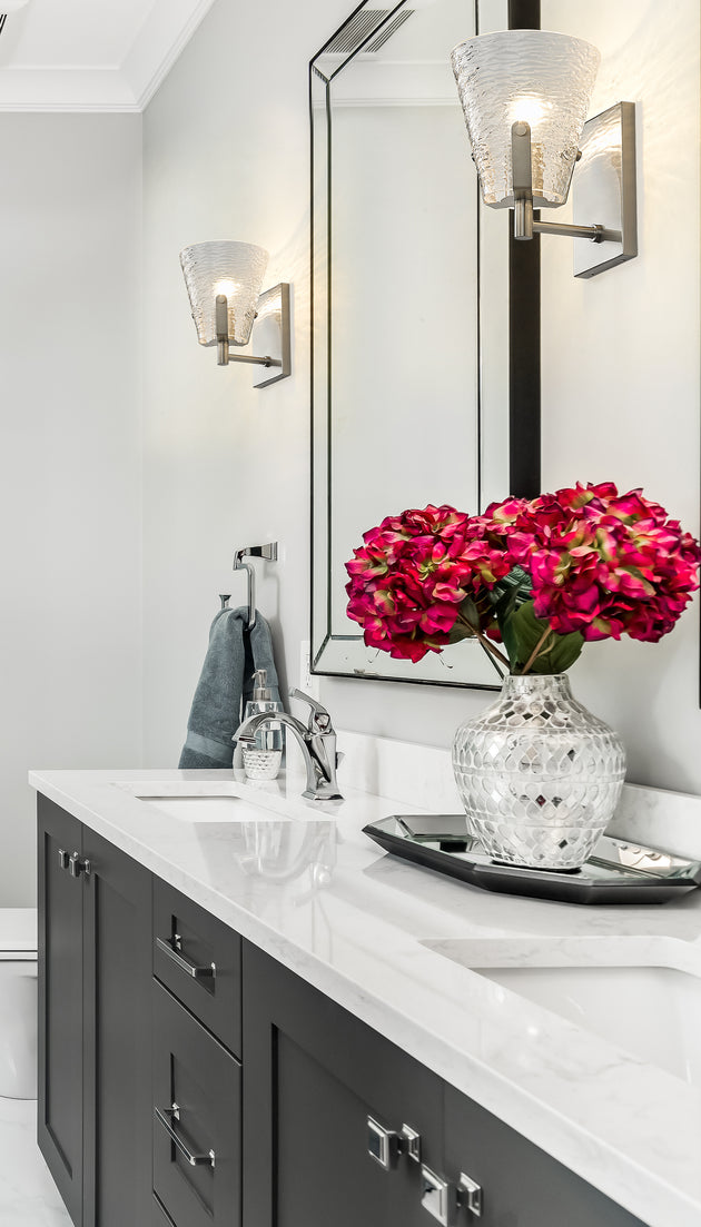 Regular price $90.001 Light Wall Sconce The Aubrey Collection of Bath fixtures pairs its crystal designed glass shades with its graceful arm structure to achieve its stunning appearance. The look is finished in either Chrome or Brushed Nickle,... -