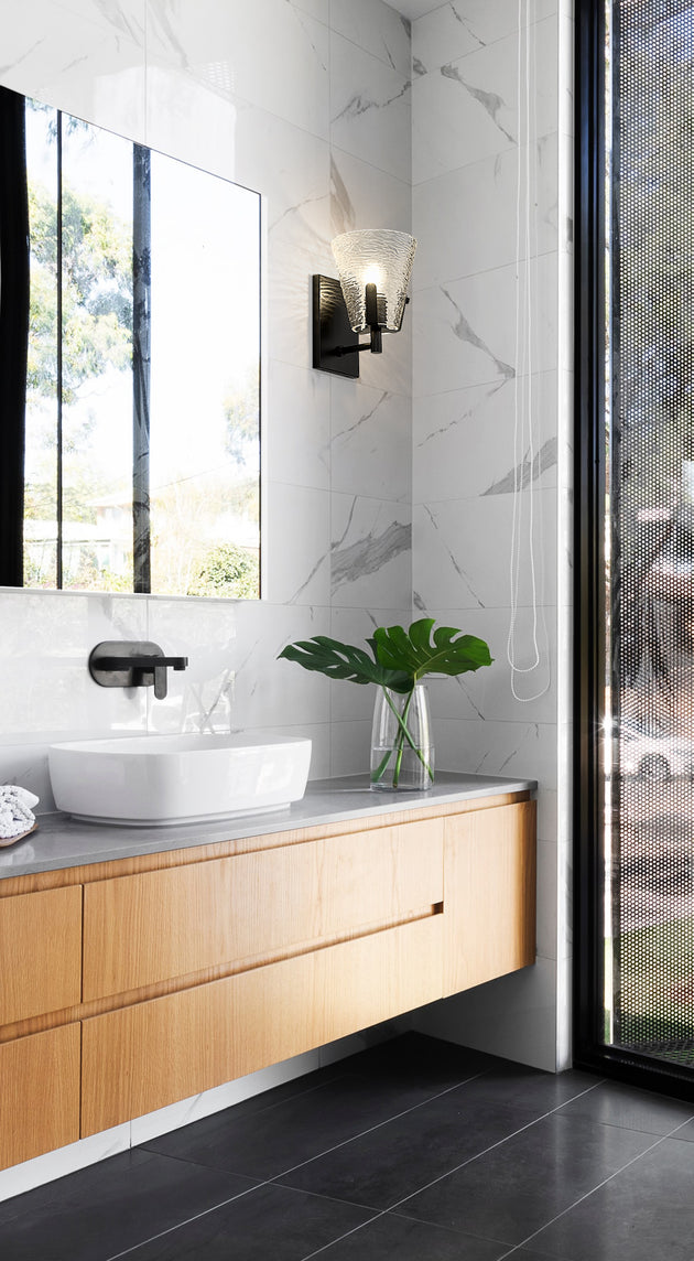 Regular price $108.001 Light Wall Sconce Evoking the look of sunlight dancing on waves, the textured surface on the Analia vanity series' handblown glass shades underscores the spa-like feeling. Available in 1- to 5-light versions and a choice... -