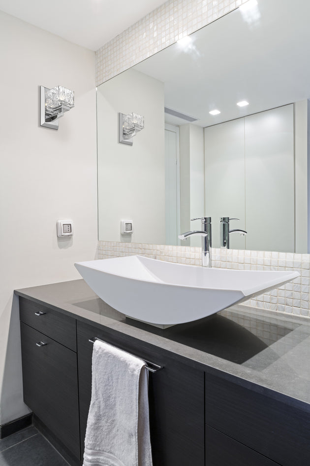 Regular price $100.001 Light Wall Sconce The Rubicon collection of bath fixtures pairs its crystal like glass shades with its comtemporary arm structure to acheive its unique appearance. The look is finished off with rich finishes of Brushed... -