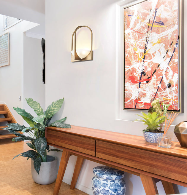 Regular price $200.002 Light Wall Sconce The Devon family is enhanced by a seamless, sculptural aesthetic that can complement a variety of room settings. Nestled within the elliptical frame is a waterglass bowl that gently diffuses the light... -