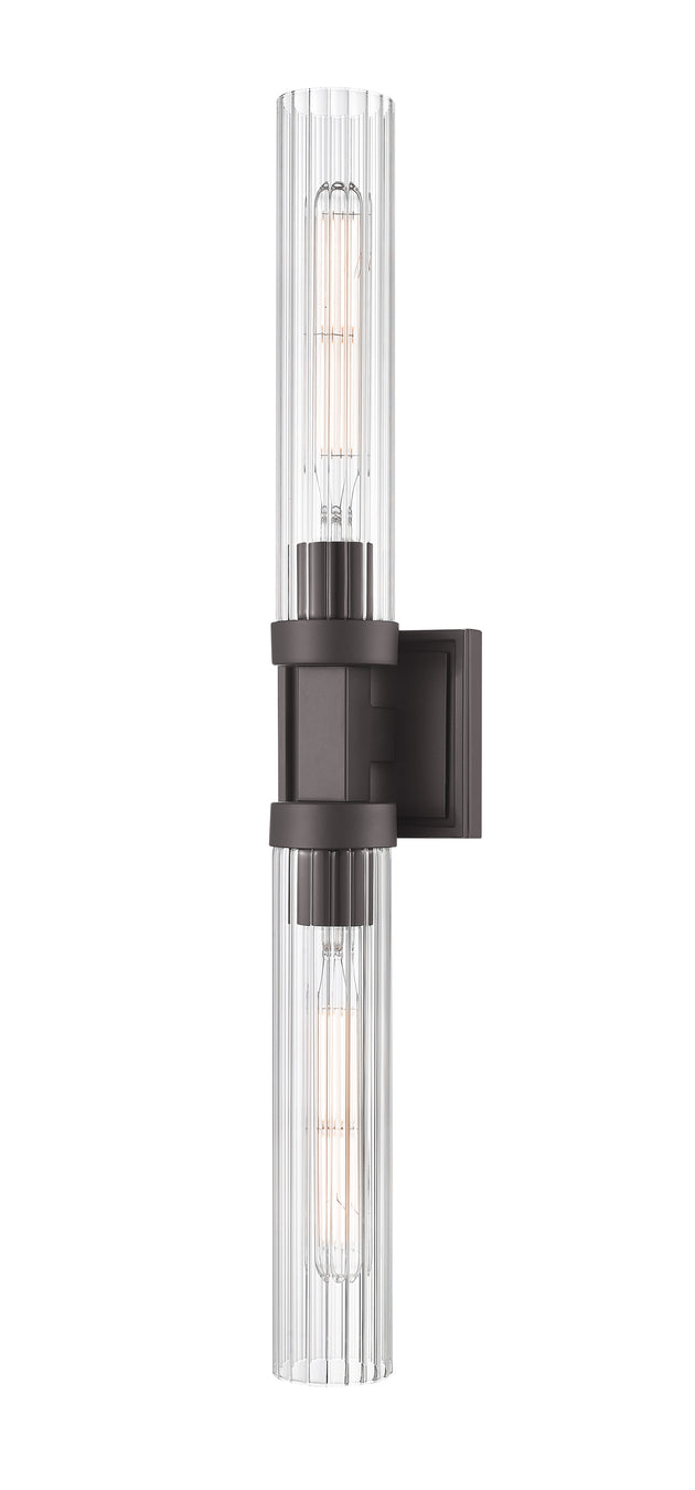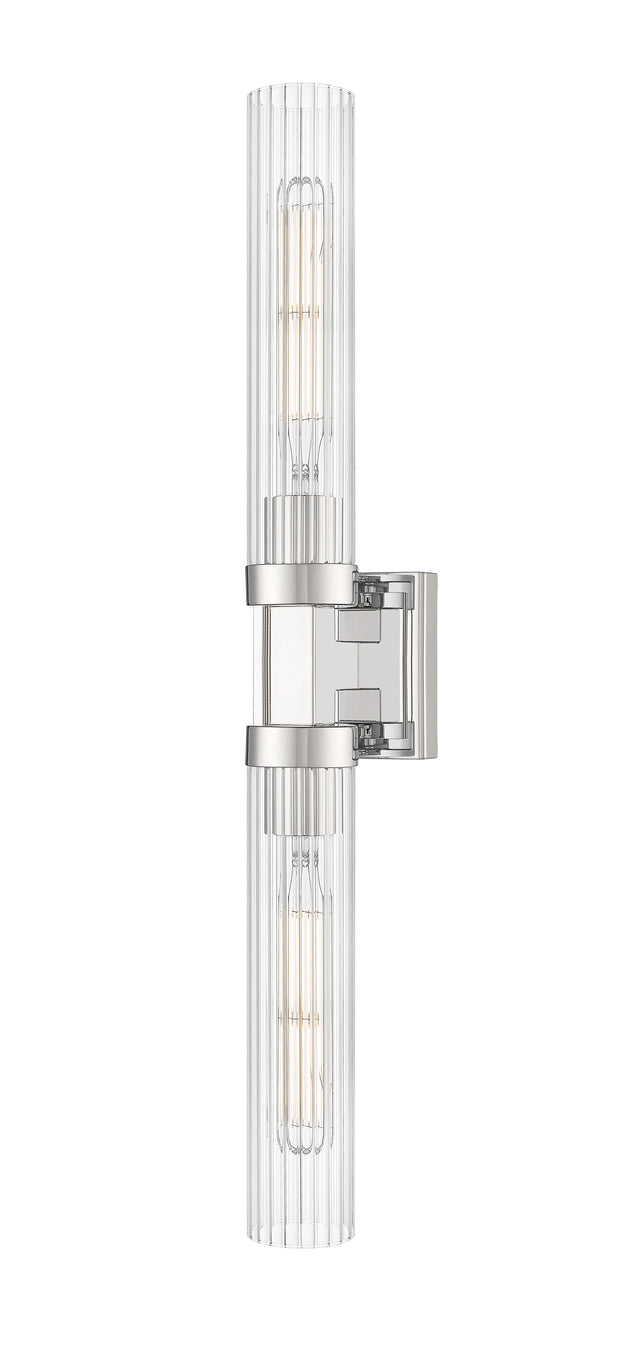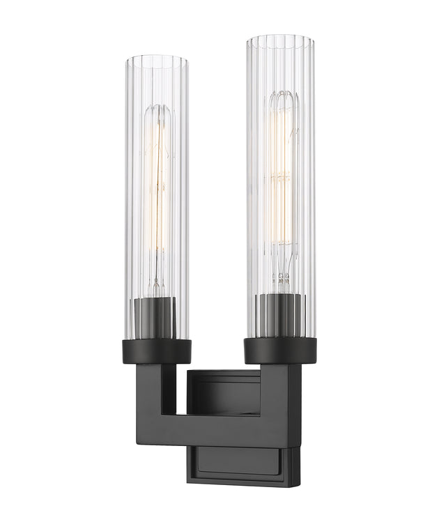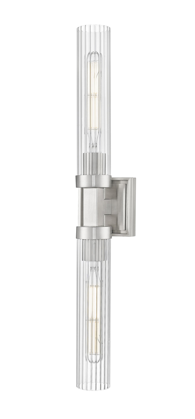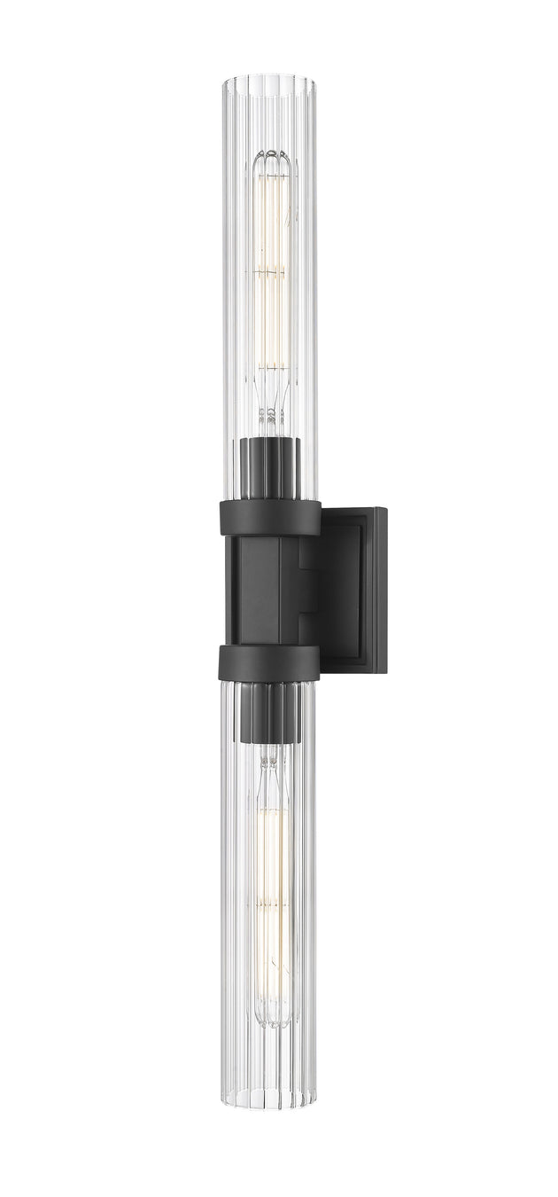 Regular price $190.002 Light Wall Sconce Slender fluted glass shades suspended on black cloth wrapped cords create this chic pendant and its surprisingly contrasting design elements. Three finishes are available to complement your décor, Brushed Nickel, Matte Black,... -