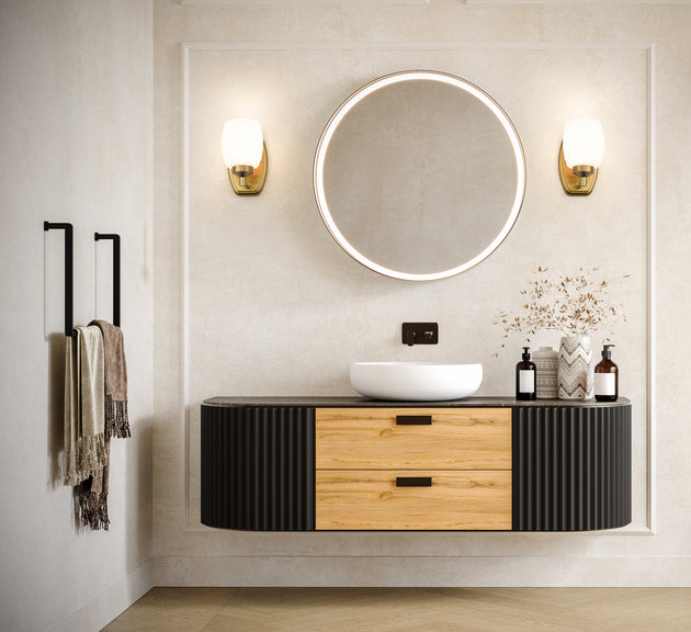 Regular price $84.001 Light Wall Sconce Is there anything more perfect in design than a circle? The Sutton bath series embraces the familiar shape in its backplate and echoed by the open-edge globe shades that can be mounted... -