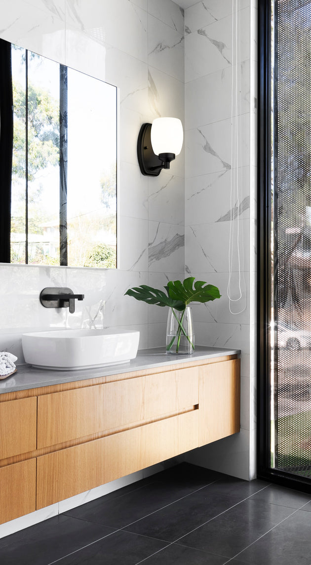 Regular price $84.001 Light Wall Sconce The gently rounded shape of the Kendrick vanity series brings an organic feel to the matte opal glass shades. Able to enhance any bath setting from traditional and transitional to contemporary, Kendrick... -