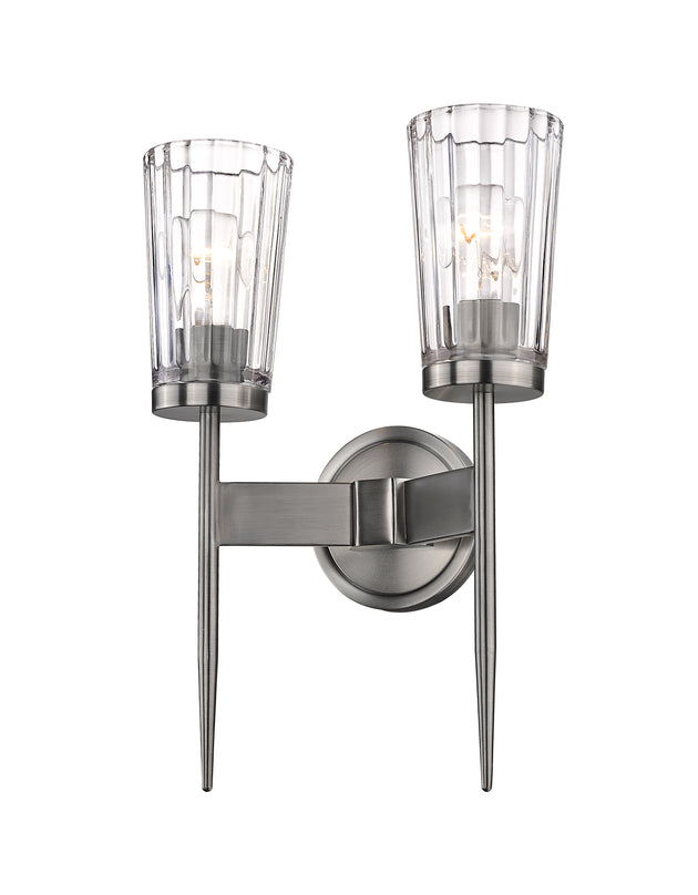 Regular price $81.902 Light Wall Sconce Flair demonstrates elegance in its meticulously designed silhouette. Exquisitely flared glass shades sit upon an extended stem, creating an impression of balance and simplicity. The Polished Antique Nickel finish highlights the sleek... -
