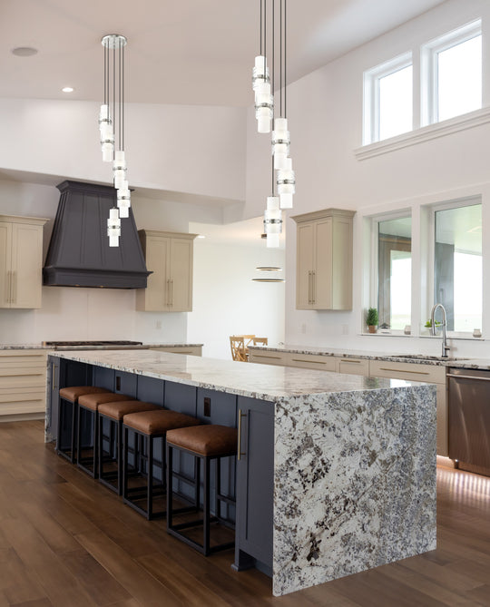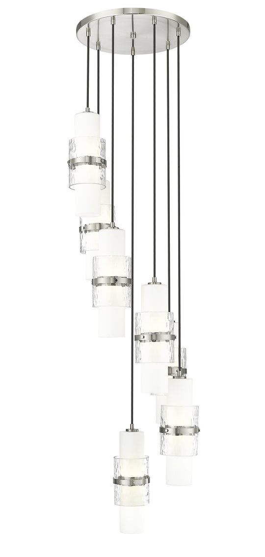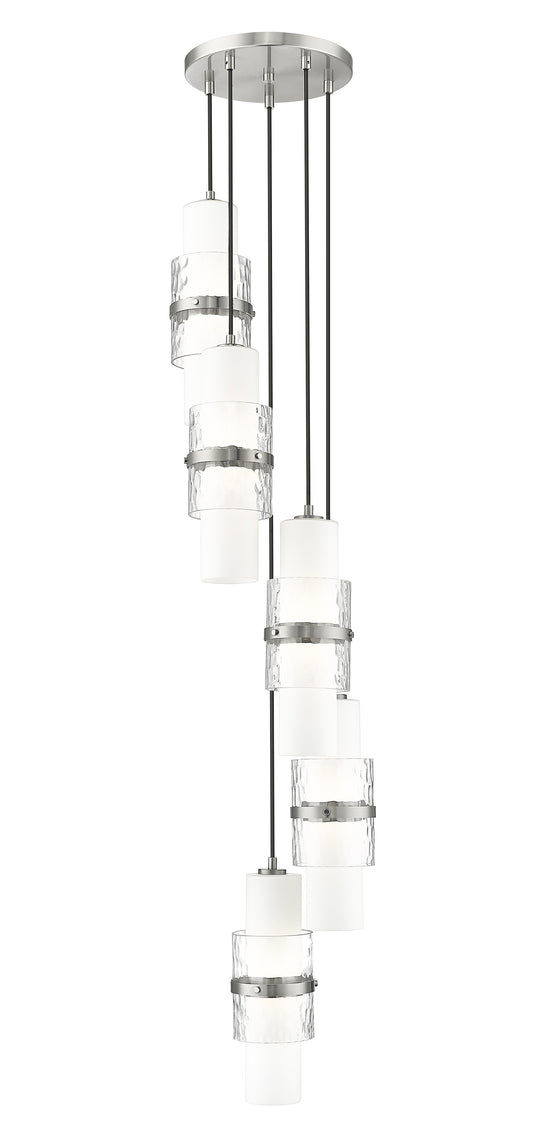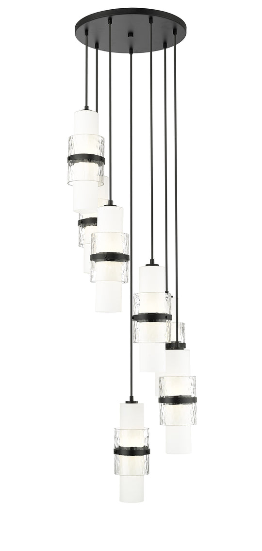7 Light Chandelier A modern style with a classic touch, the Cayden family features an opal white glass cylindrical shade, next we add a cylinder of textured glass finished off with a decorative cuff, and suspended...Regular price $1,154.00