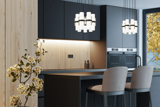 27 Light Chandelier A modern style with a classic touch, the Cayden family features an opal white glass cylindrical shade, next we add a cylinder of textured glass finished off with a decorative cuff, and suspended...Regular price $5,262.00 -