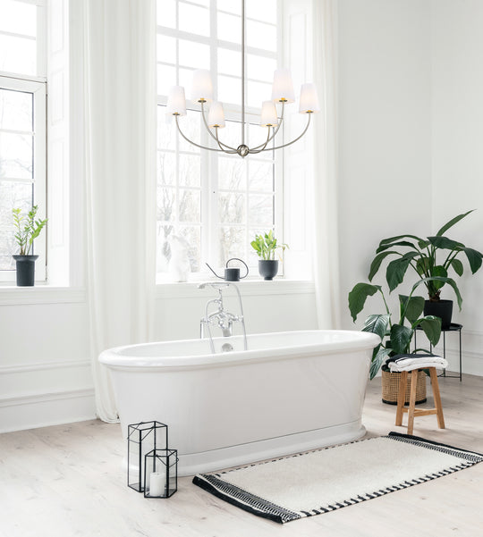 6 Light Chandelier Feminine lines in a slender silhouette define the Shannon chandelier, which will beautifully illuminate a grand dining room, great room, banquette, or kitchen island while subtly blending in with the overall décor. Available...Regular price $384.00