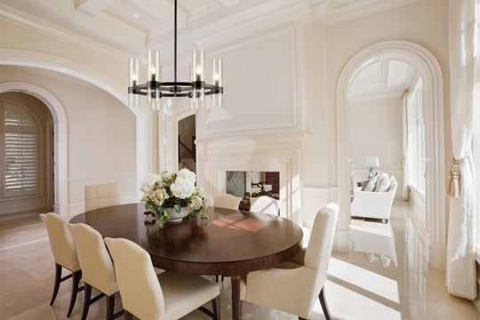 6 Light Chandelier A distinctively styled frame, combined with a Modern Minimalist sensibility, makes Datus a visual feast for the eyes. Crafted of solid steel, unadorned metal bands hold the slender glass cylinders in a state...Regular price $690.00 -