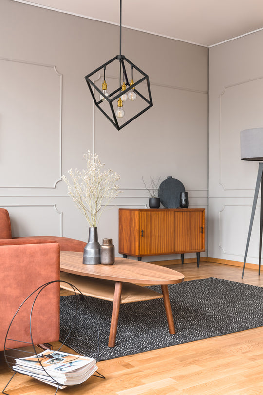 4 Light Chandelier Bold and artistic, the Vertical Pendant makes a striking focal point in any modern or eclectic space. A series of steel, open-framed cubes are suspended at various lengths from braded black cords. Available...Regular price $286.00