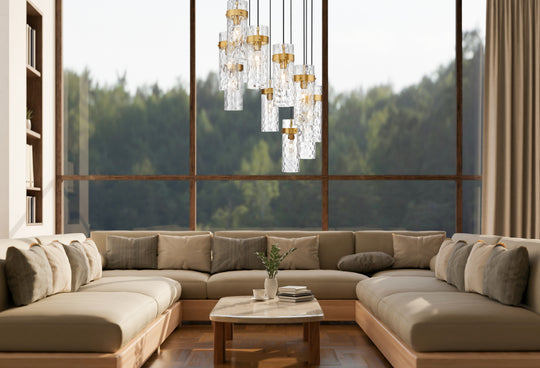 11 Light Chandelier Cylindrical glass shades add subtle elegance to the Fontaine collection. Fontaine features rippled glass and a braided cord for an upscale aesthetic that will enhance as a single pendant as well as multi-canopy...Regular price $1,638.00 -