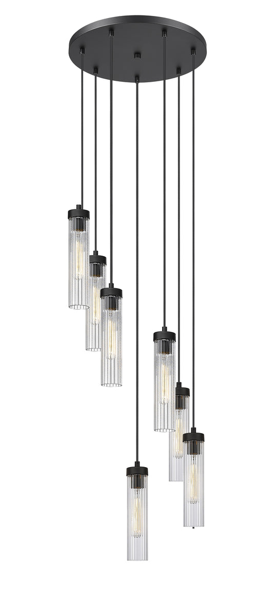 7 Light Chandelier Slender fluted glass shades suspended on black cloth wrapped cords create this chic pendant and its surprisingly contrasting design elements. Three finishes are available to complement your décor, Brushed Nickel, Matte Black, and...Regular price $894.00 -