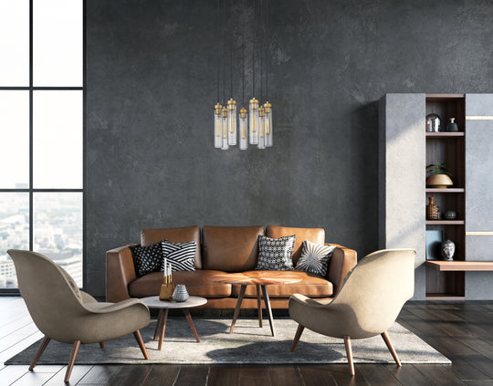 7 Light Chandelier Slender fluted glass shades suspended on black cloth wrapped cords create this chic pendant and its surprisingly contrasting design elements. Three finishes are available to complement your décor, Brushed Nickel, Matte Black, and...Regular price $718.00 -