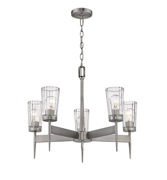 5 Light Chandelier Flair demonstrates elegance in its meticulously designed silhouette. Exquisitely flared glass shades sit upon an extended stem, creating an impression of balance and simplicity. The Polished Antique Nickel finish highlights the sleek hand-welded...Regular price $208.00 -