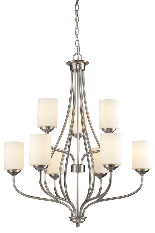9 Light Chandelier --- Matte opal glass sitting atop the graceful curving arms give the Cardinal family its transitional style. The brushed nickel finish is perfectly paired with matte opal glass to complete this up-to-date family...Regular price $291.20 -