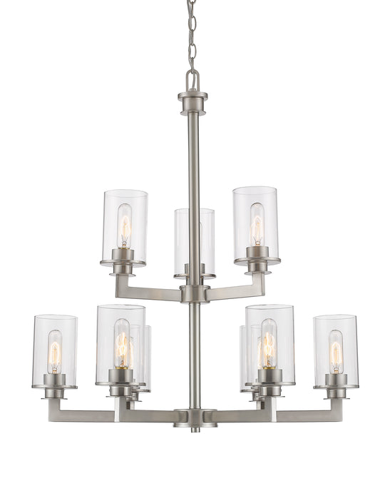 9 Light Chandelier The contemporary Savannah family adds sophistication to home décor. The beautifully appointed brushed nickel fixtures are perfectly paired with clear glass shades. Modern art influenced style makes this mid-century modern nine-light chandelier glow...Regular price $405.60 -
