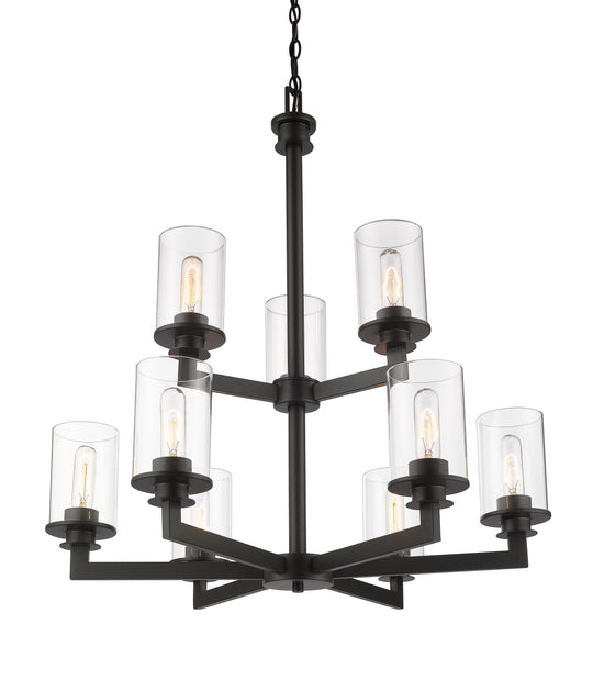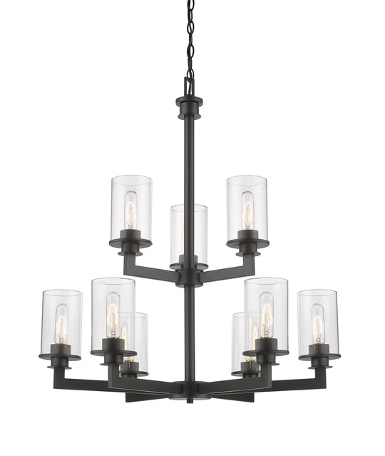 9 Light Chandelier The contemporary Savannah family adds sophistication to home décor. The beautifully appointed bronze fixtures are perfectly paired with clear glass shades. This mid-century modern nine-light chandelier gets a touch of elegant charm with...Regular price $380.90 -