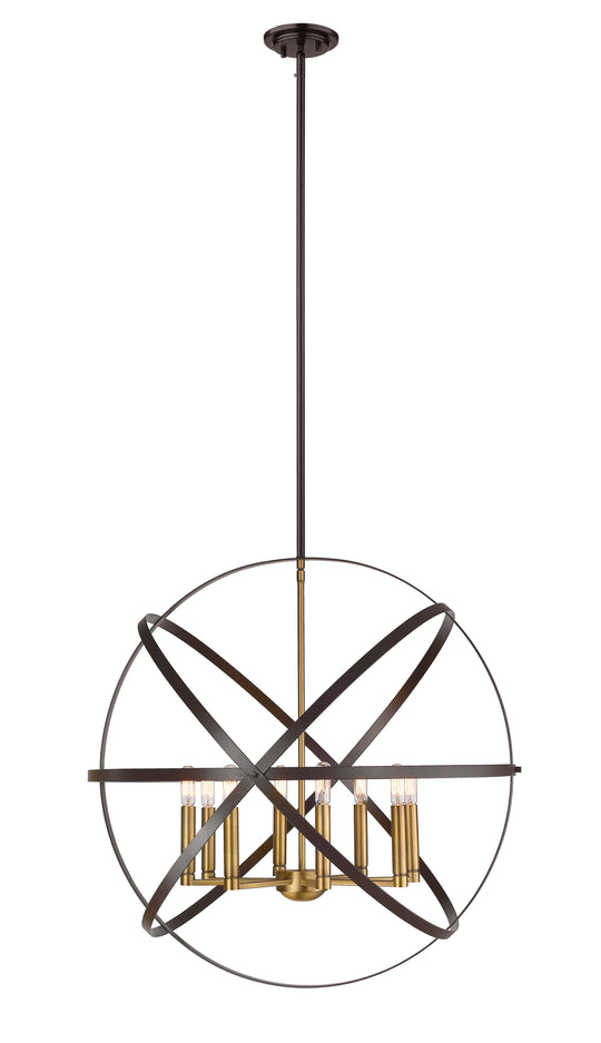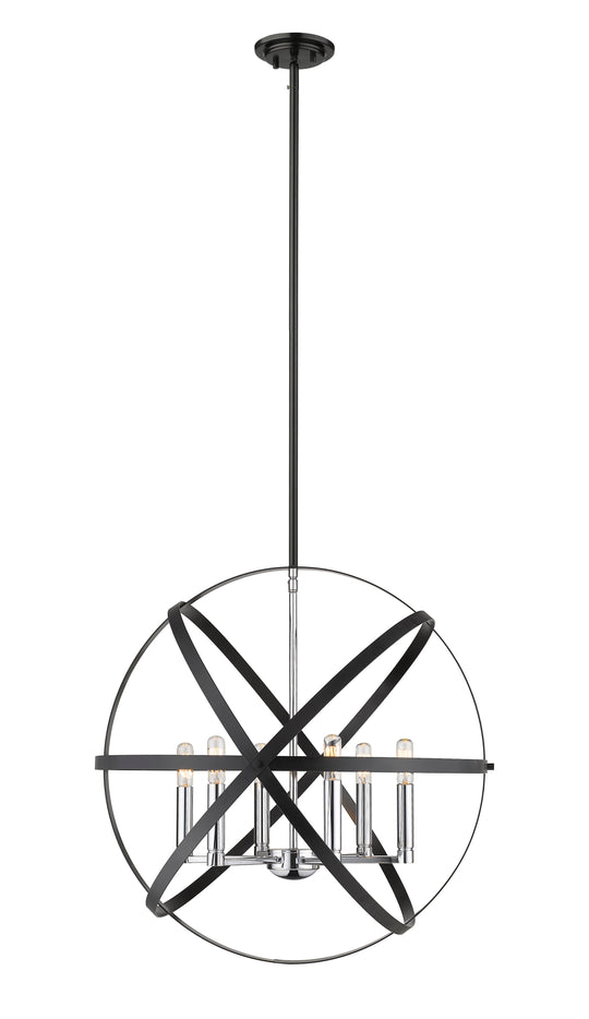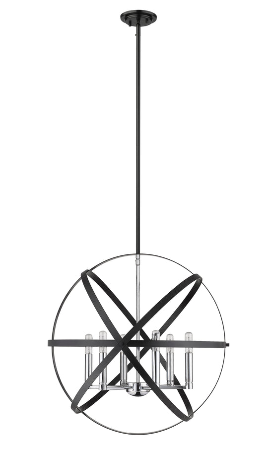 6 Light Chandelier The transitional décor options are endless with the Cavallo collection. The orbs are created using flat iron ribbons, which enclose uniquely designed contemporary styled candelebras. The specialty finishes include Hammered Black with Chrome...Regular price $261.30 -