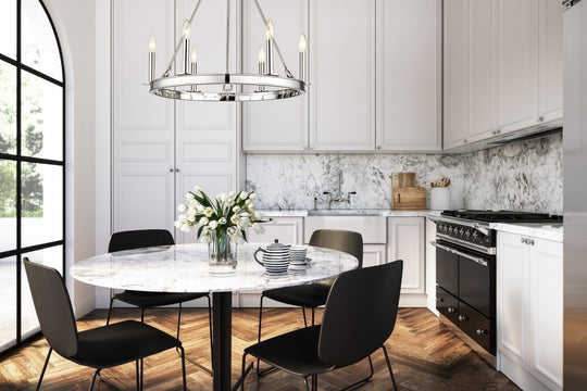 8 Light Chandelier The Barclay Collection offers a simple, minimalist silhouette, available in round, square and rectangle shapes. This collection complements today’s design trends with optional colored candle cover sleeves. Black fixtures come with black, nickel...Regular price $421.20 -