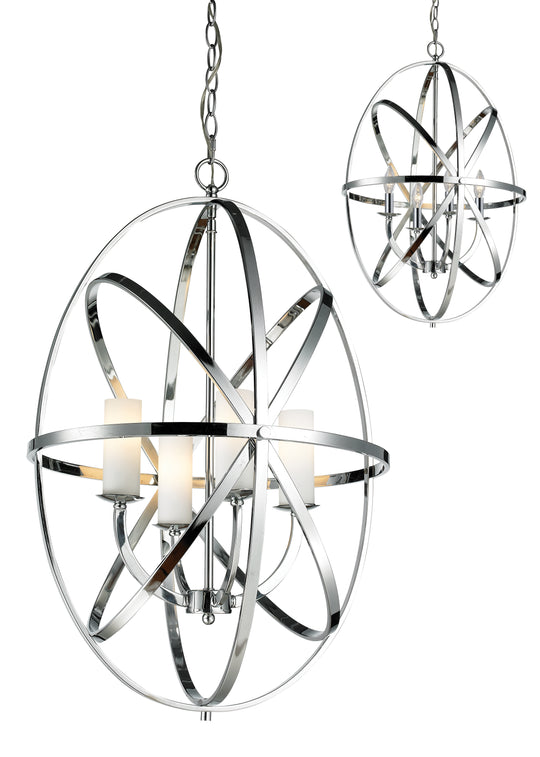4 Light Chandelier --- Orbiting metal bands circle the contemporary inner chandelier. This family is made up of round and oval shapes finished in Chrome finishes complimented with matte opal glass. Specifications Style Number 6027-4L-CH Install...Regular price $377.00 -