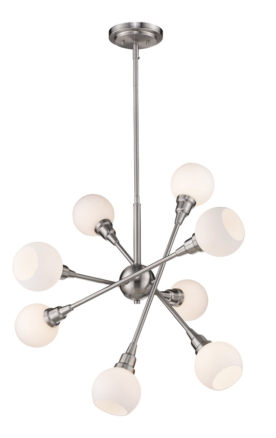 8 Light Chandelier --- Bold modern lines paired with soft and elegant detailing define the unique Tian collection. The Brushed Nickel finish paired with Matte Opal globe shades contemporize the Tian Collection. Specifications Style Number 616-8C-BN...Regular price $253.50 -