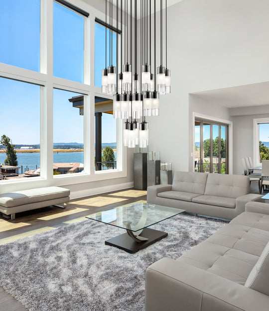27 Light Chandelier Sleek and simple lines define the Alton pendant. This deceptively substantial design pairs a steel housing with artesian glass and a cloth-covered black braided cord for a modern touch. Available in singles or...Regular price $3,684.00 -