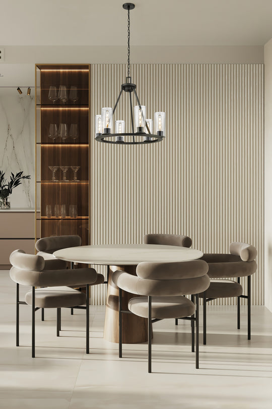 6 Light Chandelier The Titus vanity series makes a bold fashion statement with tapered clear glass shades and tubular bulbs. Rings of light with the option to have the glass shade positioned up or down –...Regular price $556.00 -