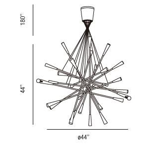 A complex statement yet simple in design. This sculptural light uses different materials and textures to create the focal point. Polished spun metal rods with chromed tips and canopy, braided cable supports