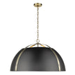 Finally, fashion meets function in a refined, oversized dome pendant with the ability to cast ample light. Aldrich is a stylish collection of industrial-inspired pendants designed to push bright ambient and task light through the tops and bottoms of metal shades. Heavy-duty rivets provide aesthetic appeal and utility, securing the matching wide steel straps to the coordinating shade. Created to complement a wide variety of interior styles, from modern to rustic, these pendants are available in multiple finish combinations. The frame is offered in multiple finishes with a selection of different shades to complete the look. This 8-light pendant is graciously sized for large rooms.