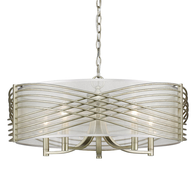 Vendor: Golden Zara Five Light Chandelier in White Gold Regular price $0.00Zara is a fashionable, transitional style. Thin bands of steel in a soft, White Gold finish flow elegantly around a sheer fabric shade in a unique, cross-woven design. The bold rectangular arms are echoed by the...