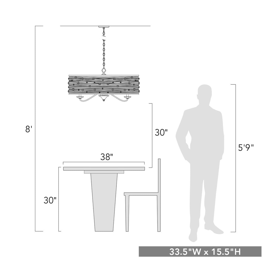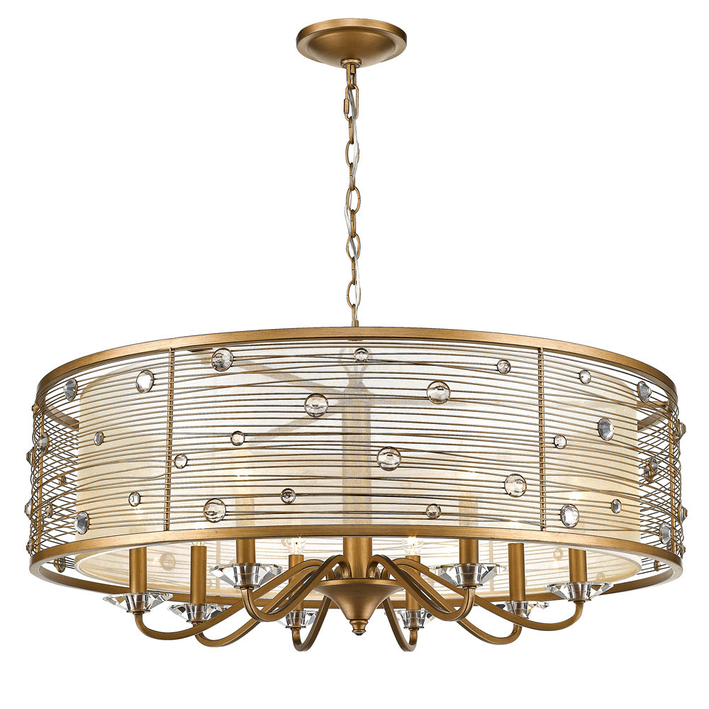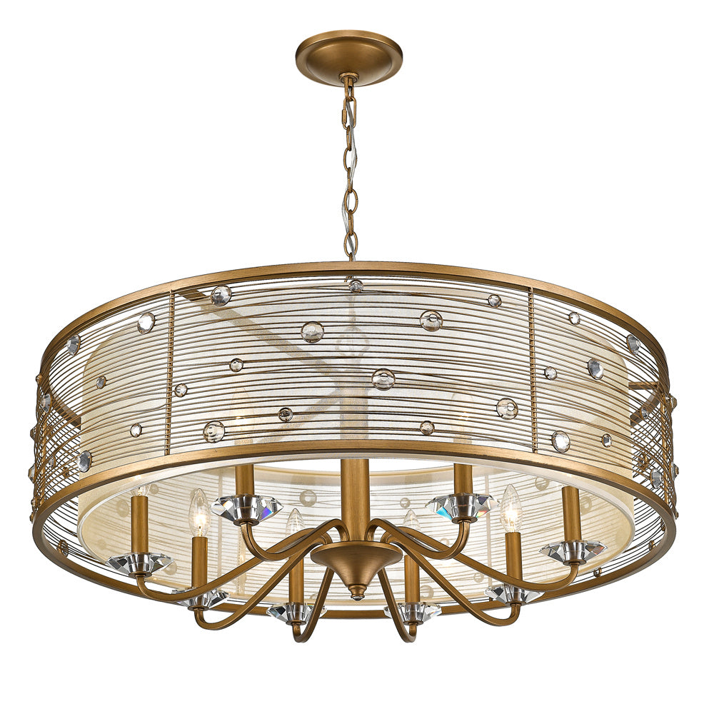 The Joia collection was inspired by jewelry. Transitional in style, the fixtures are ideal for eclectic and contemporary room decors. The collection is offered in multiple hand-painted finishes. The hand-wrapped wire frames are accented with crystals that glisten when lit. A fabric shade romantically diffuses the light. Chandeliers create stylish focal points and this 8-light chandelier is graciously sized for a generous dining room or entry.
