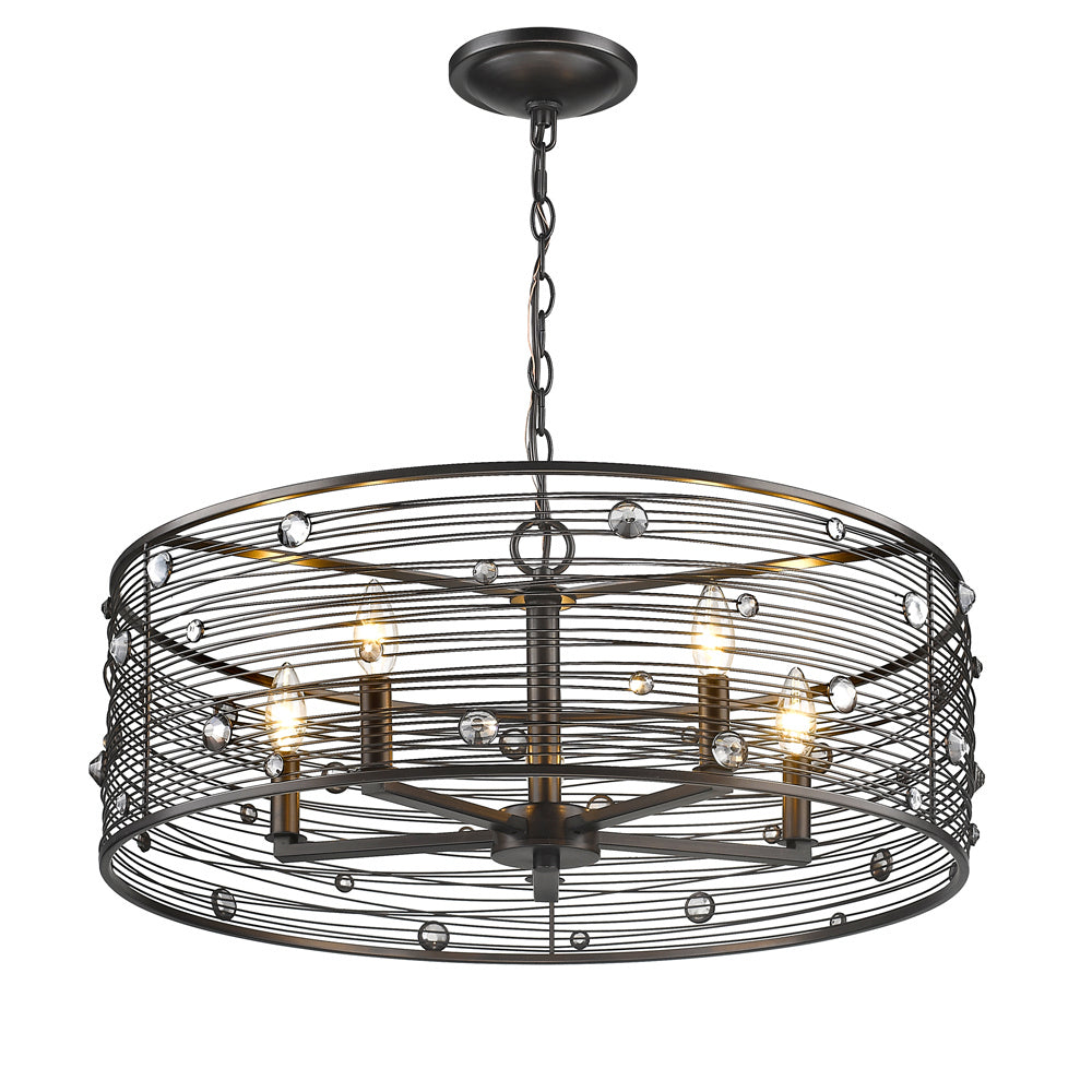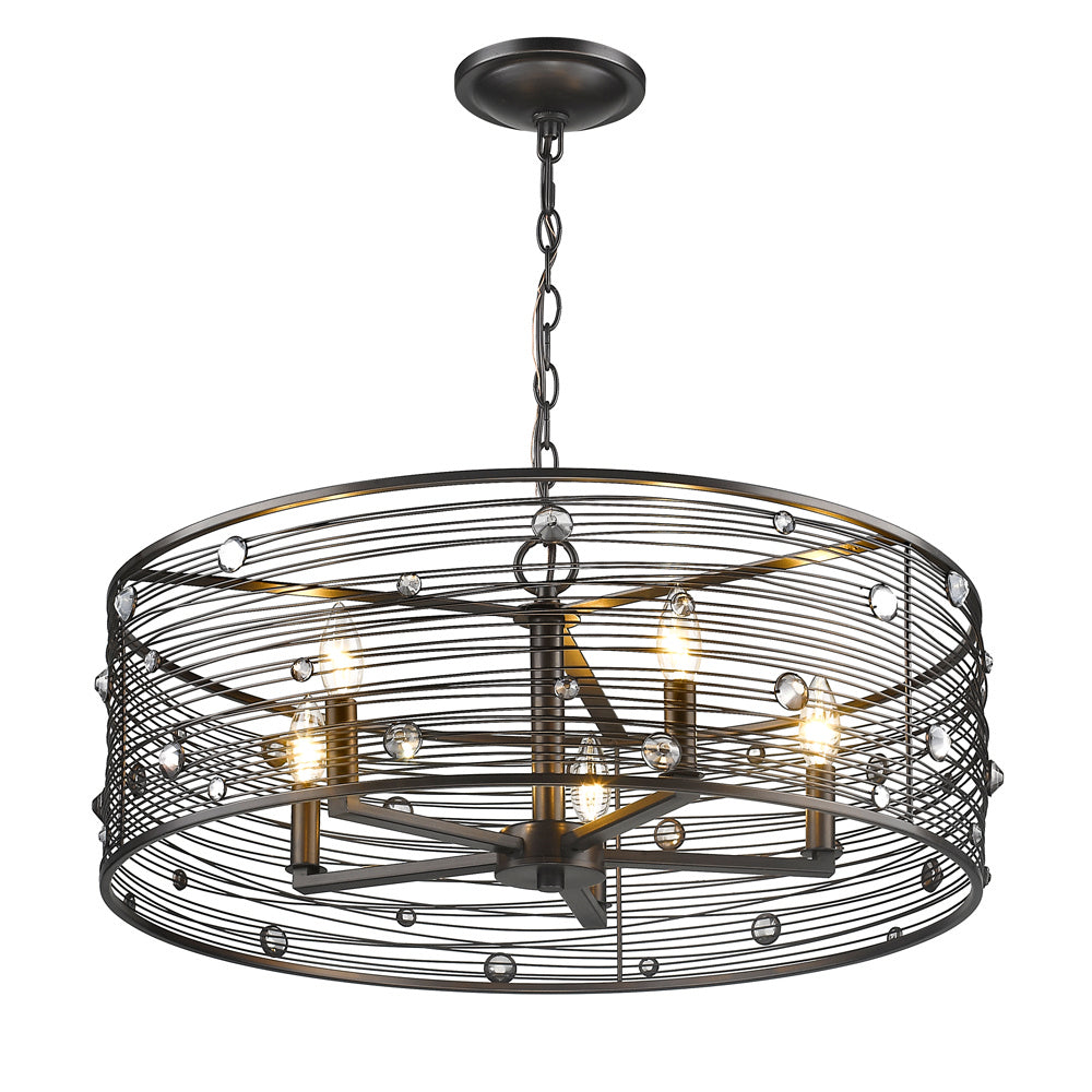 Bijoux is a jewelry-inspired collection of industrial-chic fixtures. Partially exposed bulbs shine coyly through hand-wrapped wire shades, lighting the lustrous faceted crystals. A dark beauty, the collection features a hand-painted multi-layered Brushed Etruscan Bronze finish. Transitional in style, the fixtures are ideal for eclectic and contemporary room decors. Chandeliers create stylish focal points and this 5-light chandelier is comfortably sized for an intimate dining room or entry.