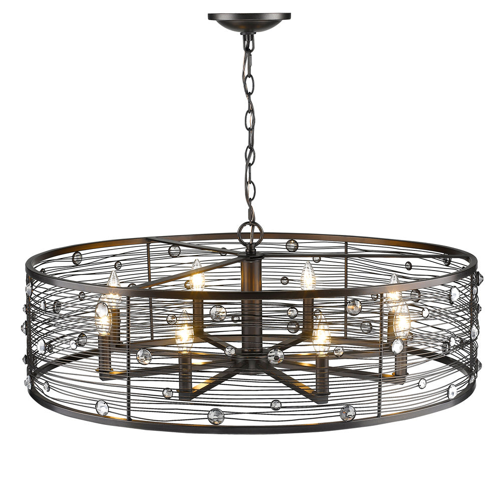 Bijoux is a jewelry-inspired collection of industrial-chic fixtures. Partially exposed bulbs shine coyly through hand-wrapped wire shades, lighting the lustrous faceted crystals. A dark beauty, the collection features a hand-painted multi-layered Brushed Etruscan Bronze finish. Transitional in style, the fixtures are ideal for eclectic and contemporary room decors. Chandeliers create stylish focal points and this 8-light chandelier is graciously sized for a generous dining room or entry.