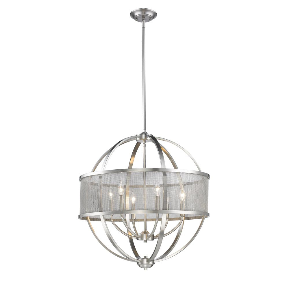 Colson is a collection of transitional and industrial-chic fixtures. Ideal for lofts, farmhouses and contemporary interiors, curvaceous arms sit inside simple round frames. The collection offers an extensive line of ceiling fixtures. Fixtures may be purchased with or without metal mesh shades. The optional shades shield the exposed bulb of these elemental fixtures. The fixtures are available in a variety of modern finishes. This 6-light chandelier creates a stylish focal point with warm ambient lighting that is perfect for intimate living and dining areas or task lighting.