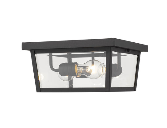 Offer lighting from above in a gazebo or deck space. Flaunting softened geometric design elements, this black finish flush mount outdoor lantern light features charming bulbs tucked behind a clear glass shade.Regular price $454.00 -