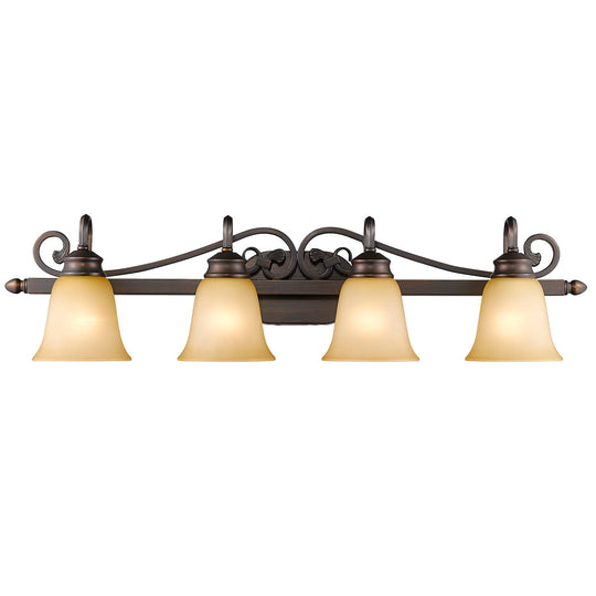 The Belle Meade collection is traditional, classic Mediterranean style with warm Tea Stone Glass and graceful scrolling arms. The Rubbed Bronze finish is perfect for cozy, casual bathrooms and this 4-light bath vanity is UL approved...Regular price $0.00 -