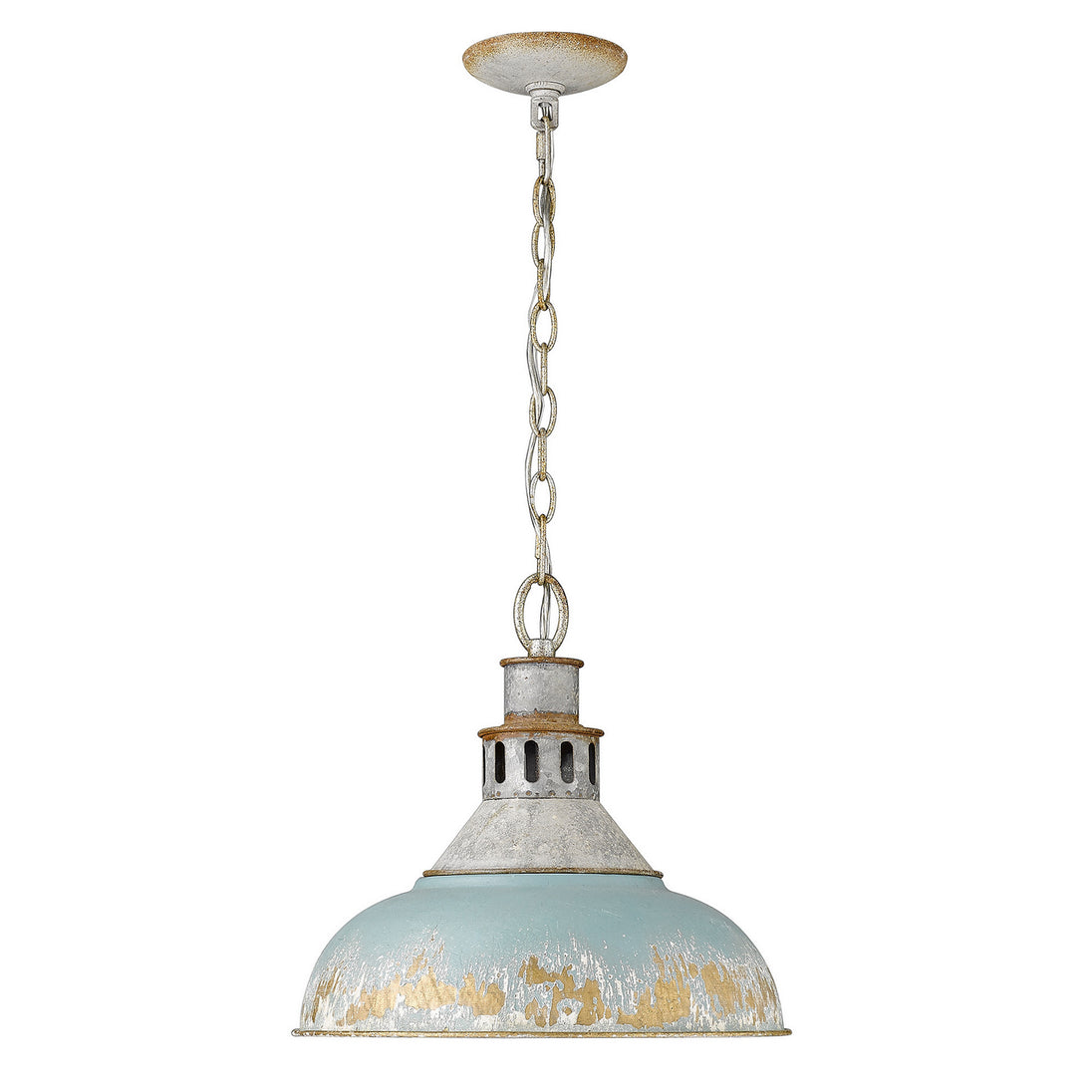 Kinsley has a rustic, vintage appeal that is perfect for homes with eclectic or farmhouse decor. The Aged Galvanized Steel frame balances the numerous antique shade color options offered in this collection. The hand-painted series has a distressed, weathered look. Choose a shade that fits your existing color scheme or opt to design around an Antique Teal, Ivory, Rust, Black Iron, or Red shade option. The pendants are large enough to hang over small dining room tables, over kitchen countertops, and in living rooms. Hang the fixtures alone or group together for a charming look.