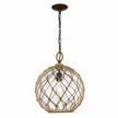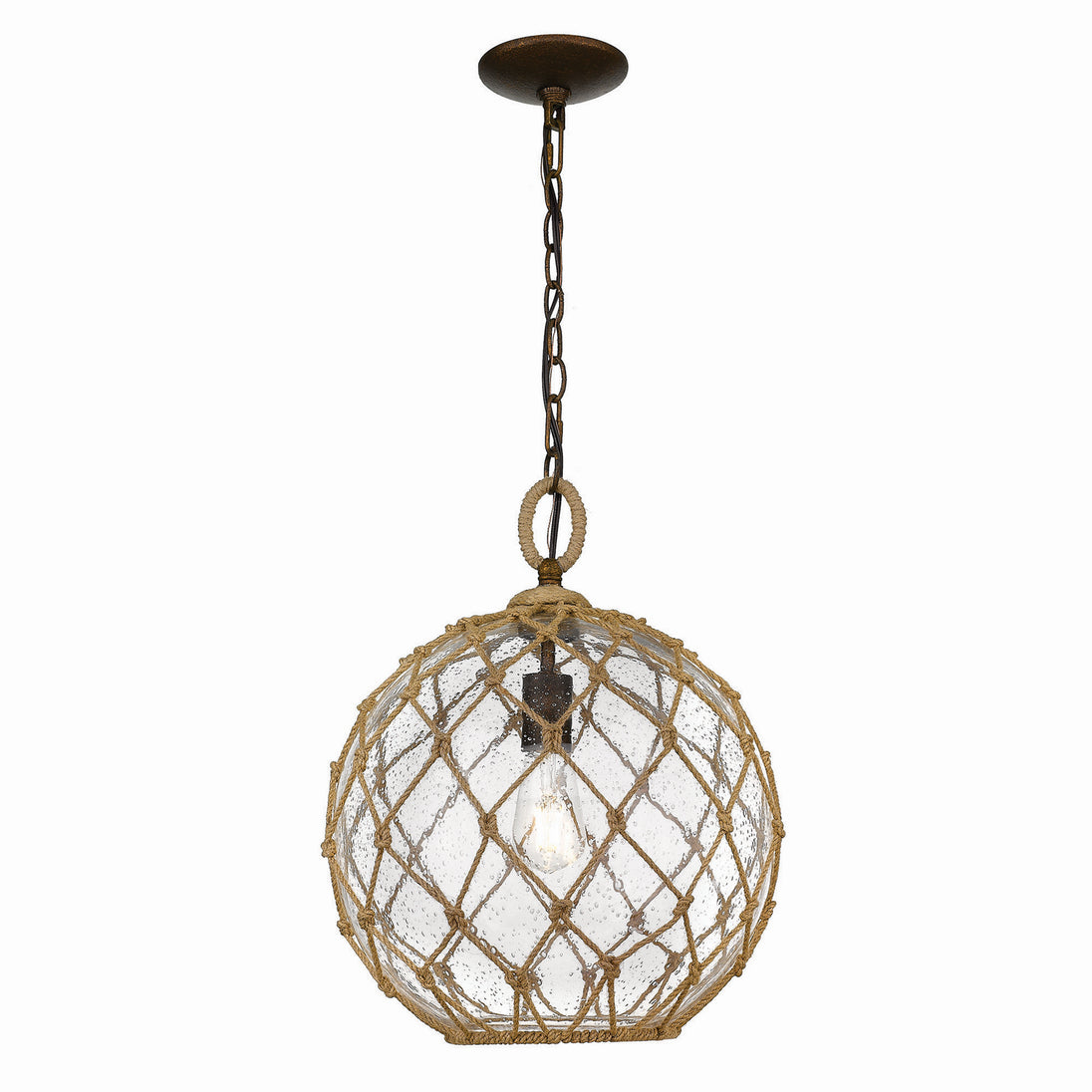 Haddoc has the look of a reclaimed sea treasure, brought home and revamped. The large, round, seeded glass is reminiscent of an iridescent bubble magically snared by a net. Enhancing the nautical-inspired design, knotted rope and contrasting hardware mimic old-world tools. These bright pendants allow for widespread illumination and are perfect in coastal settings.