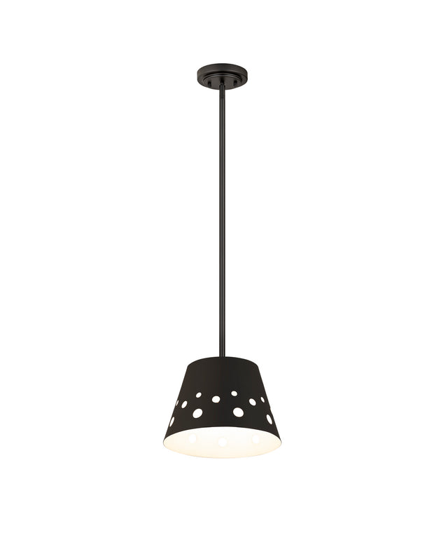 Regular price $288.00Cheery circles of various sizes dot the conical shade of this stylish pendant from the Katie collection. Perfect for casual spaces, this pendant showcases construction of matte black finish iron with a matching down rod and... -