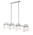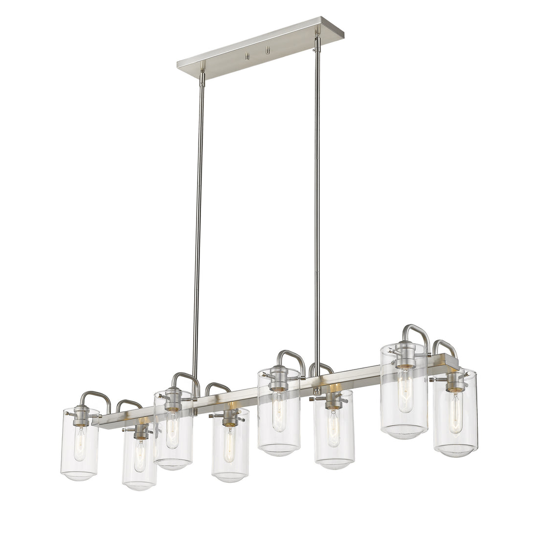 Infuse light and industrial energy into any transitional space. Brushed nickel finish steel forms a gleaming plate, downrods, and frame that make this eight-light island chandelier a perfect choice.