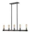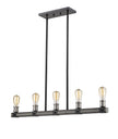 Great for a modern dining area, this five-light pendant light casts an industrial aura. A line of exposed lightbulbs brightens up the sleek silhouette with radiance against deep ashen tones.