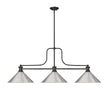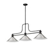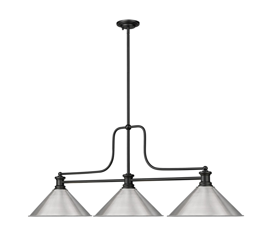 Sleek finishes and a light industrial vibe flatter this three-light billiards pendant from the Mélange collection by Z-Lite. A simple yet fluid silhouette blends matte black steel and brushed nickel steel shades forming a perfectly balanced profile. Choose this fixture for highlighting a kitchen island or sports room billiard space.